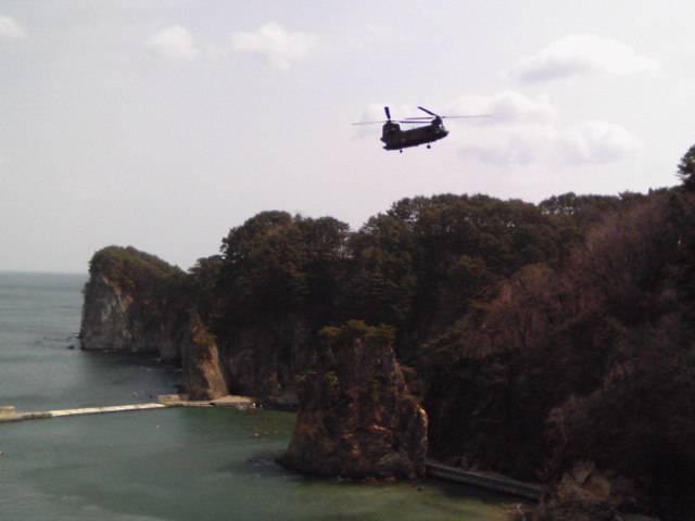 自衛隊のヘリコプターが たこの浜上空でなにかしてます。