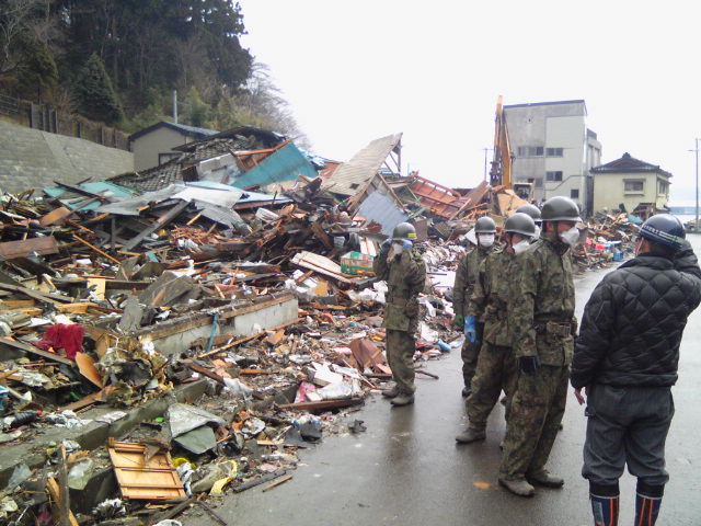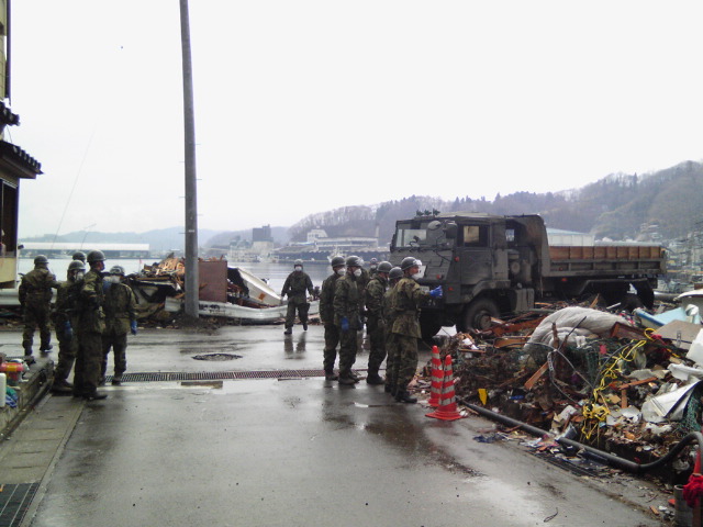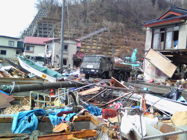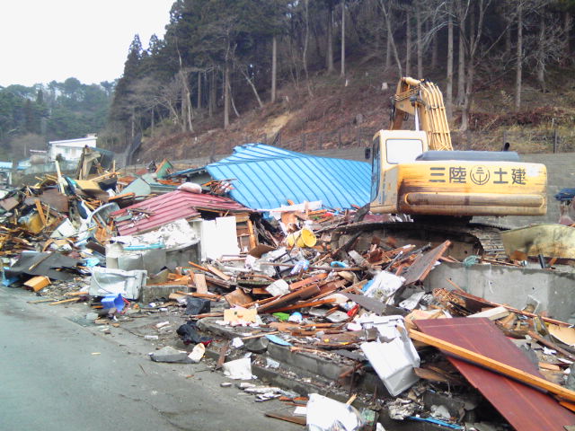 重機で解体や瓦礫撤去してダンプカーで運んでます。
