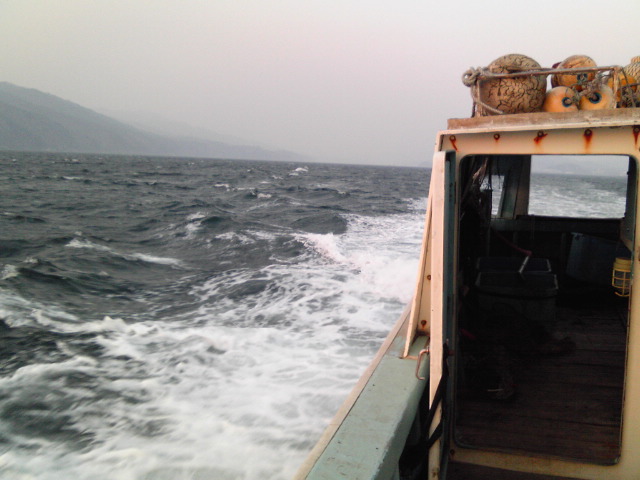 沖に出ていくにつれて西風の吹きおろしで海が大荒れ。