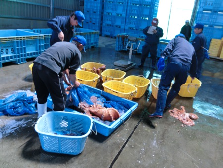 宮古市魚市場に船を横付けして水揚げ作業をしました。