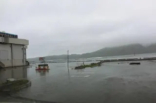 岸壁側から入るところまでは海水で冠水していて通行できない状況です。