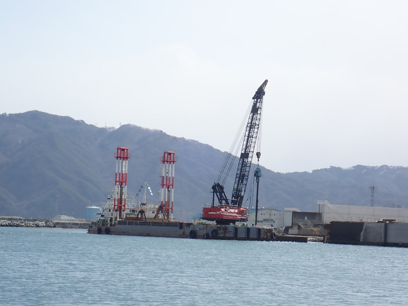 船で道具の手入れ軽作業をしながら閉伊川河口水門工事を