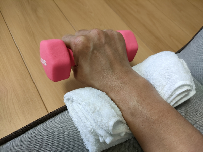 手首はダンベル1.5kgを段差負荷をかけて持ち上げ