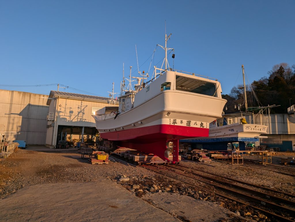 造船所に上架しドック。 ドックも終わり船を下ろしました。 来年の毛ガニ漁に備えます。 -